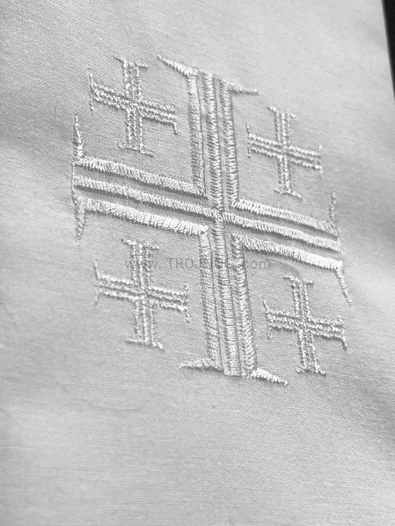 Posiada wyhaftowany biały wzór "Krzyż Jerozolimski".