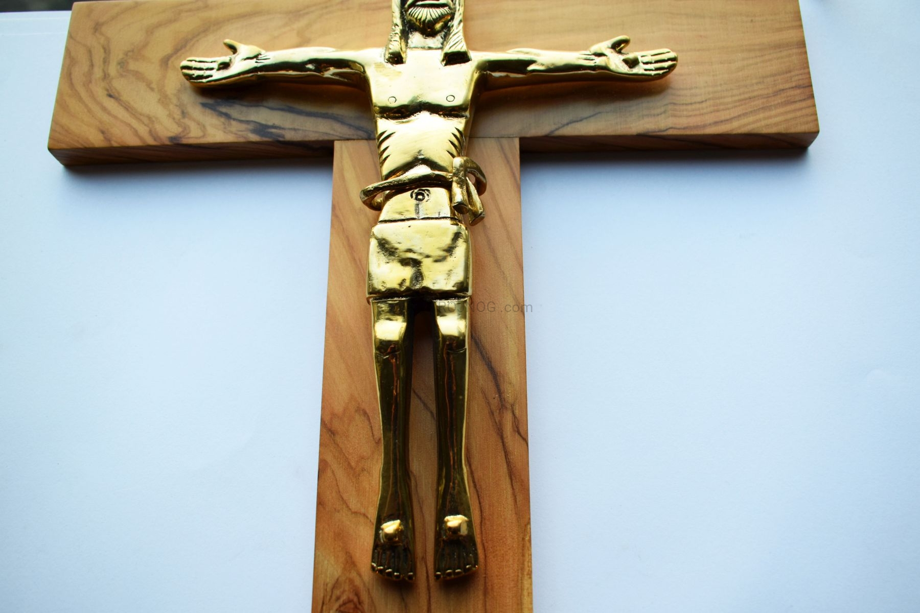 Krzyż na ścianę, wykonany z drzewa oliwnego, figura Chrystusa (z przepaską AKEDA) z mosiądzu polerowana, odkręcana.