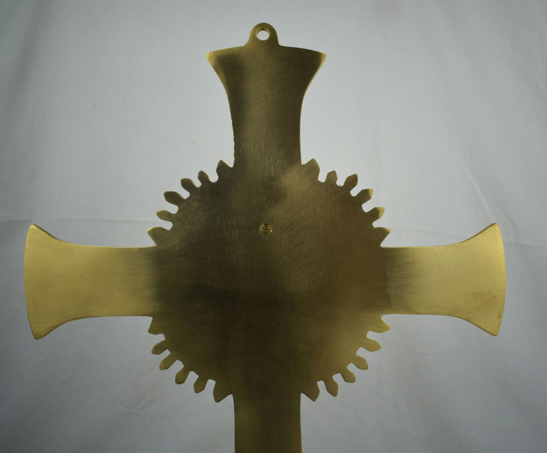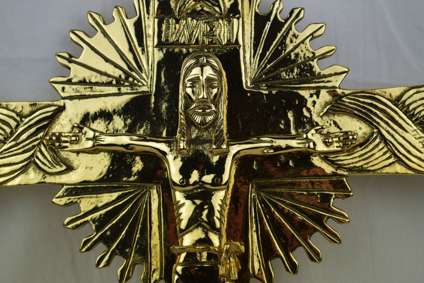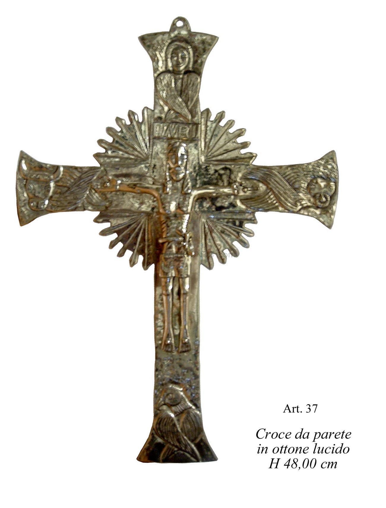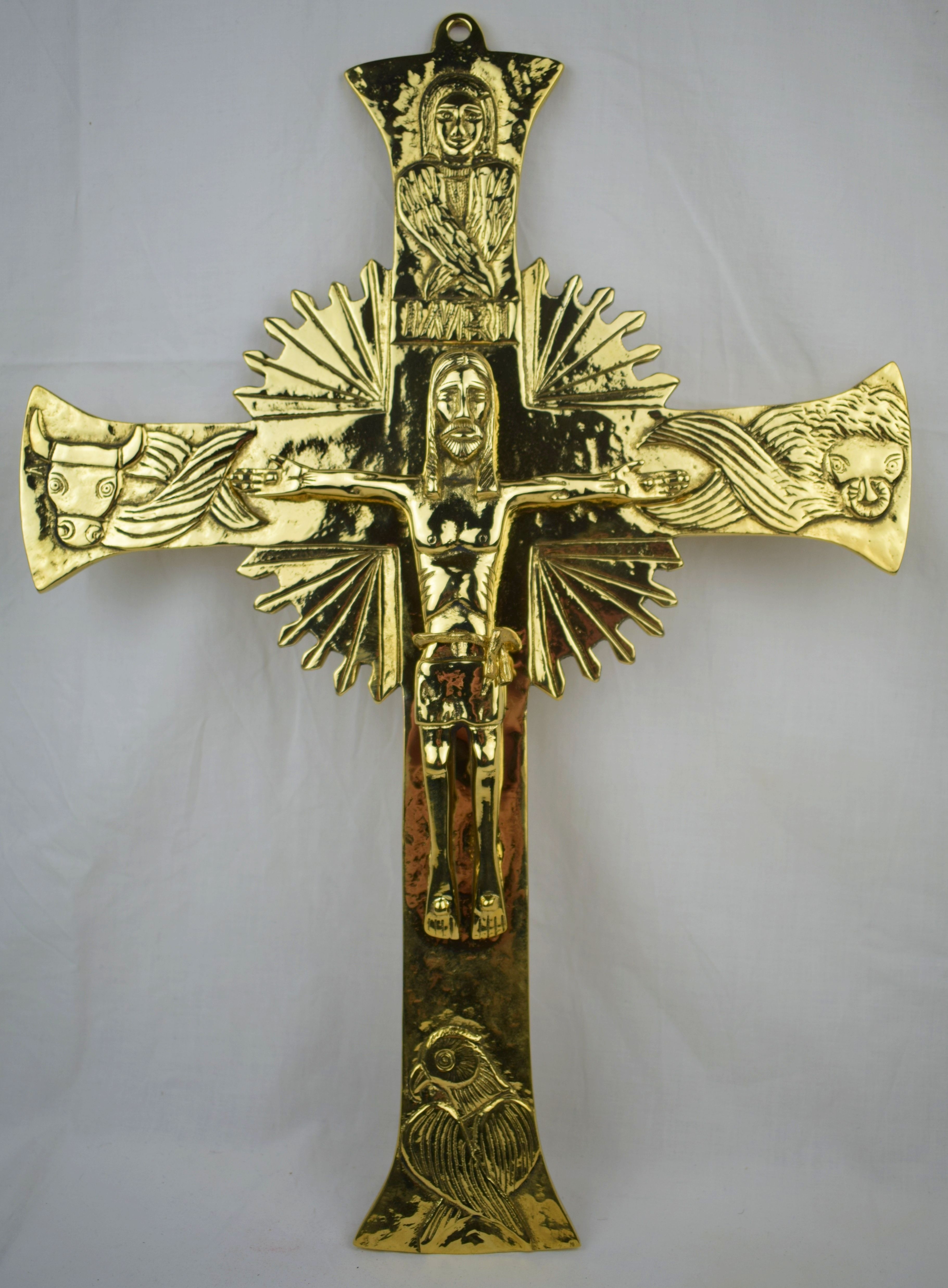 Krzyż do powieszenia na ścianę, mosiądz polerowany na wysoki połysk, zabezpieczony antyoksydacyjnie.