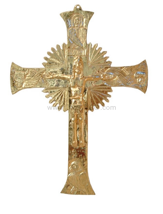 Krzyż do powieszenia na ścianę, mosiądz pozłacany żółtym 24k złotem, zabezpieczony antyoksydacyjnie.