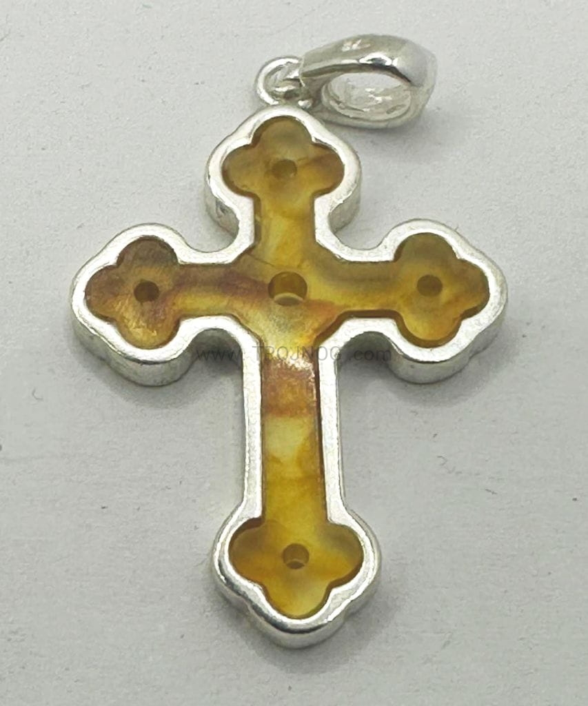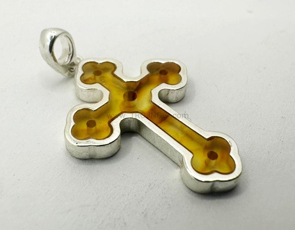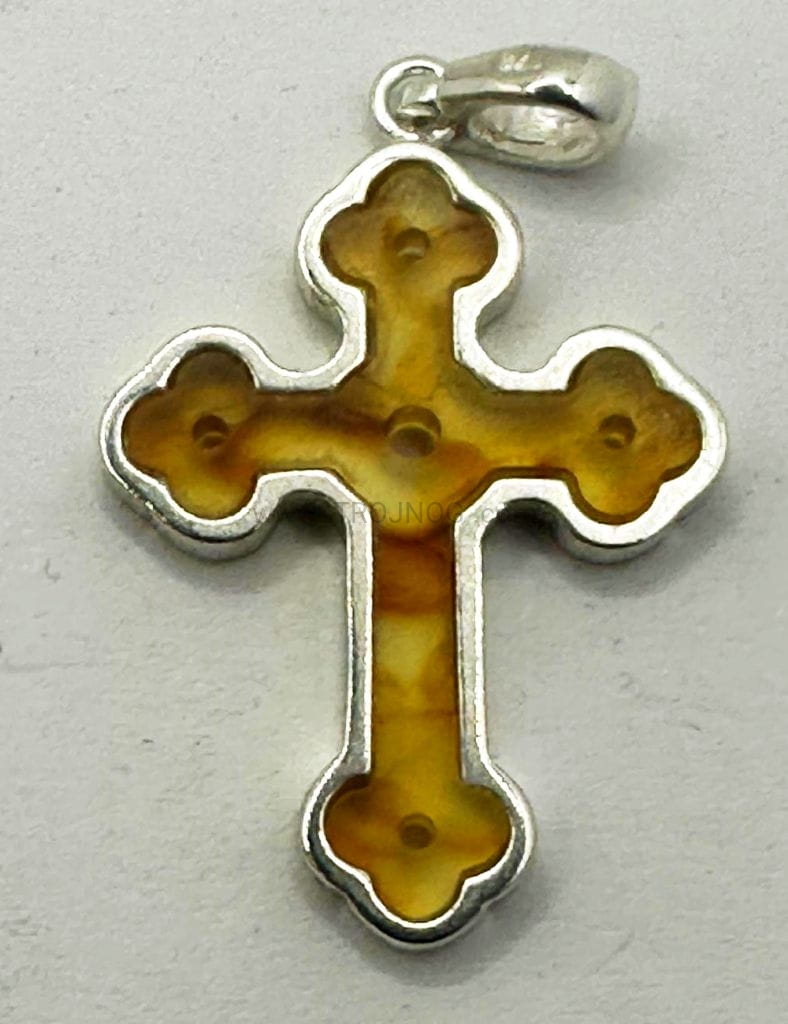 Krzyżyk na szyję, ze srebra 925, wewnątrz wypełniony bursztynem z Bałtyku.
