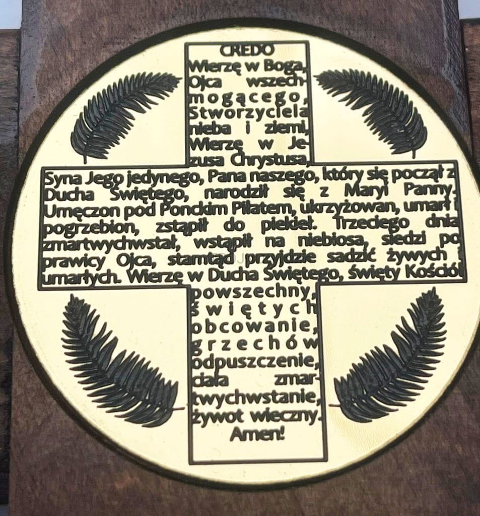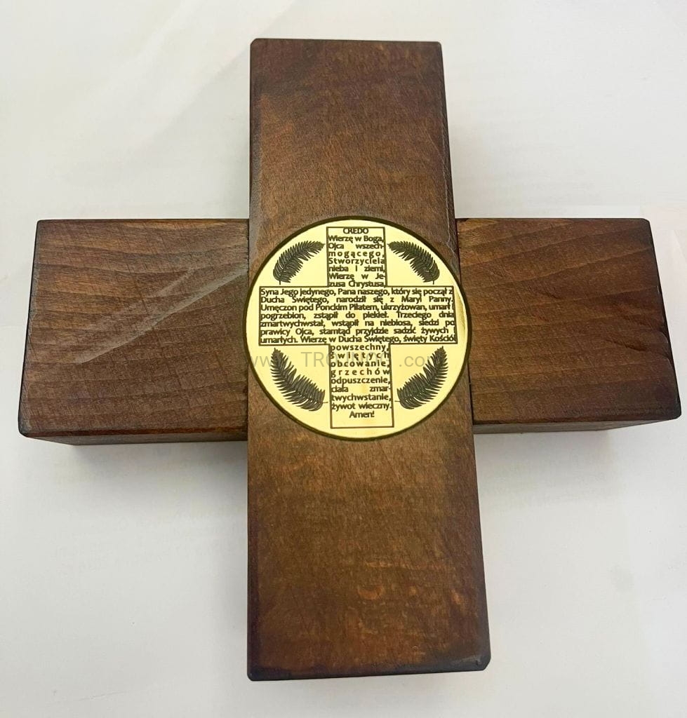 Drewniany krzyż z modlitwą CREDO, wyznanie wiary pośrodku trzymający palmę.