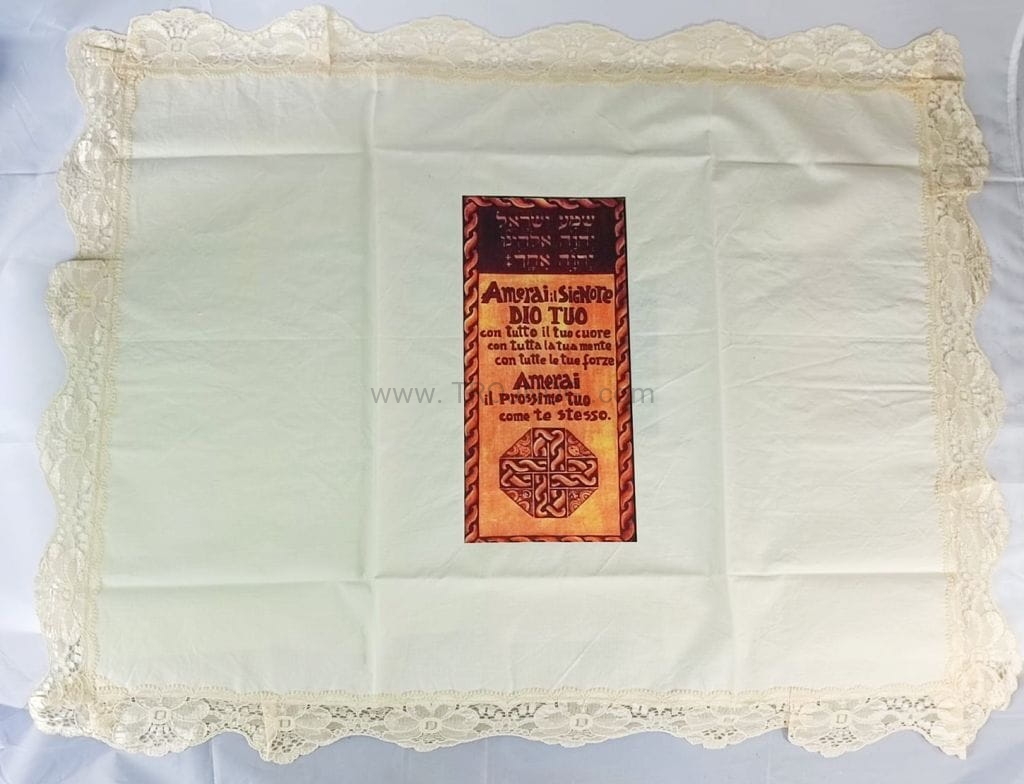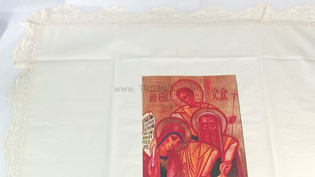 Obrus lniany prostokątny z ikoną "SHEMA","Madonna Drogi", "Święta Rodzina z Rio" pośrodku.