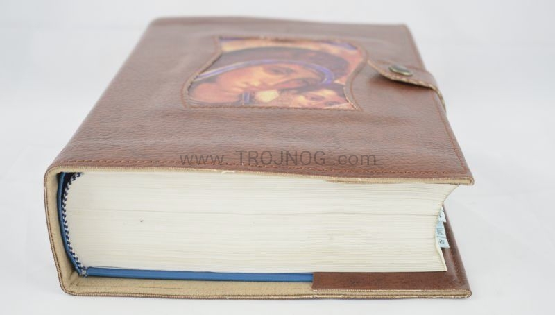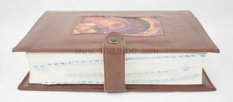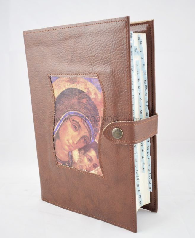 Okładka na Biblię Jerozolimską, ze skóry z wszystą ikoną, zapinana na nap, kolor brązowy, Biblia