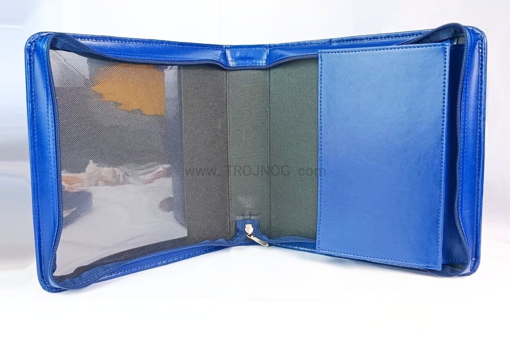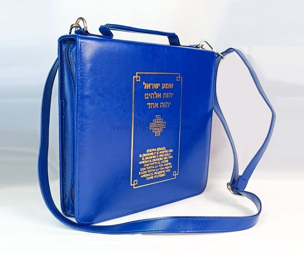 Pokrowiec na pieśni, wykonany z eko-skóry, w kolorze niebieskim z paskiem oraz uchwytem do złapania.