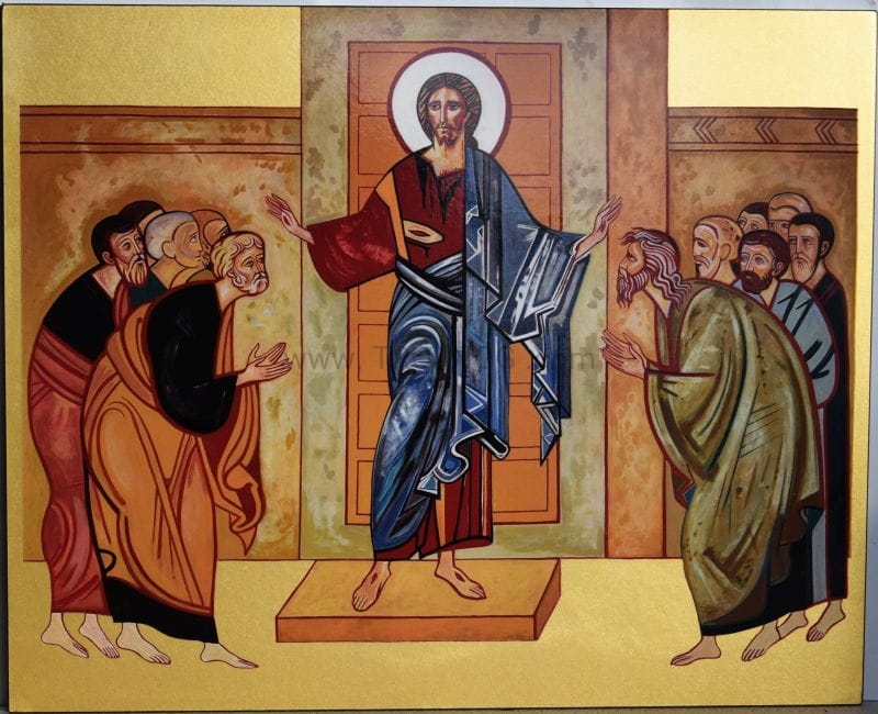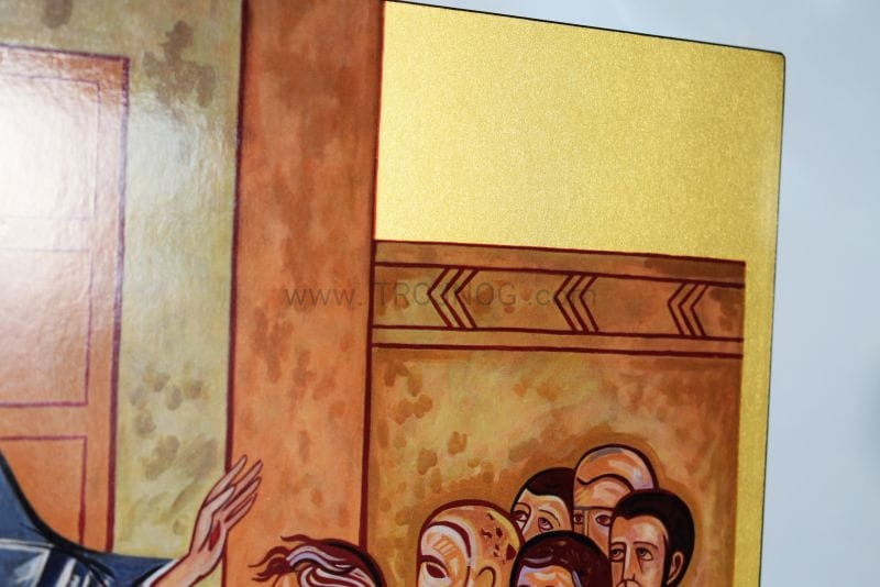 Ikona Kiko Arguello, obraz korony misteryjnej z Perugii - "wejście przez drzwi zamknięte". Wykończona złotą folią.