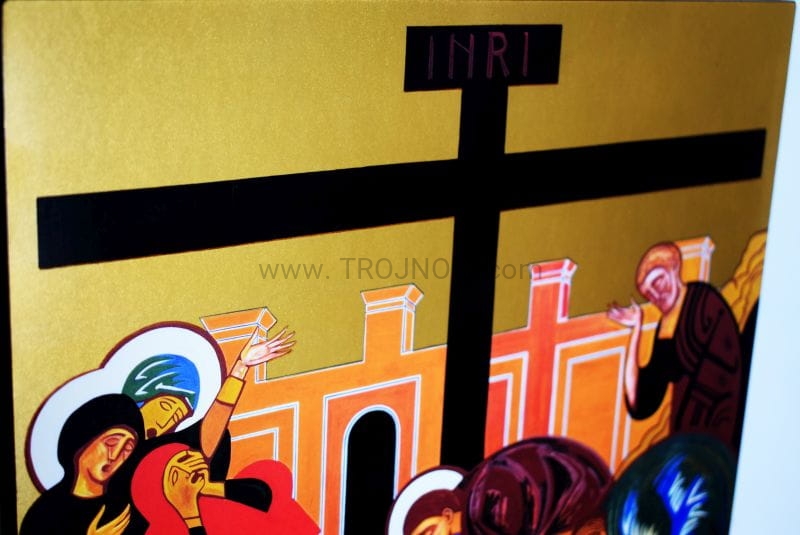 Pozłacana ikona Zdjęcie Jezusa z krzyża, Pieta 30x30 cm Korona misteryjna Kiko, złożenie do grobu