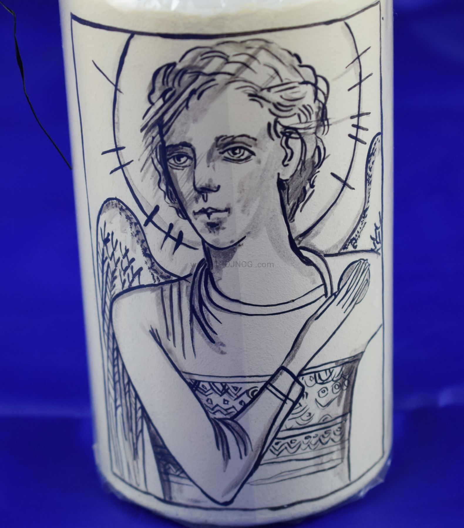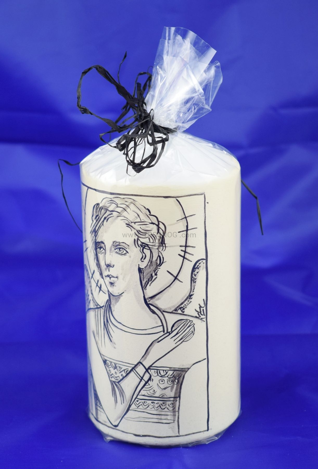 Świeca laudesowa (lub na ołtarz), z ręcznie pisaną ikoną "Anioł Stróż". Ikona Kiko z 2014 roku.