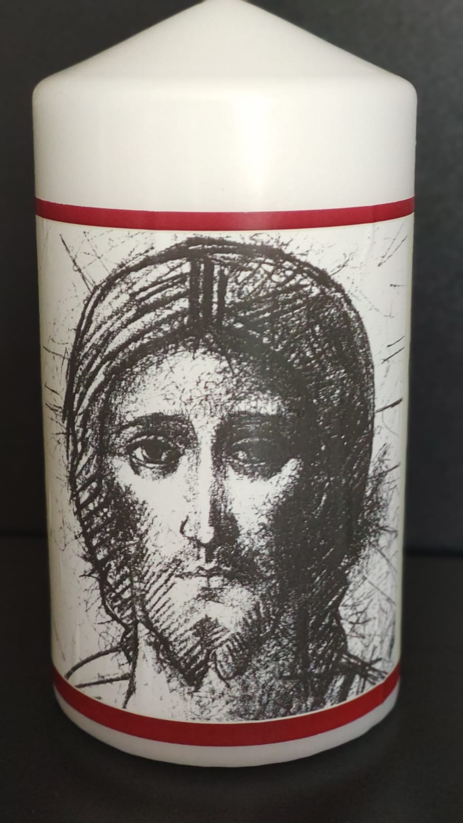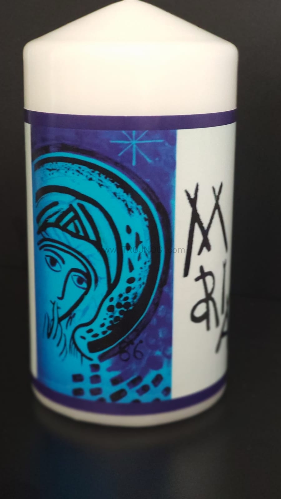 Świeca laudesowa (lub na ołtarz), z naklejoną ikoną Kiko z jasnym tłem.