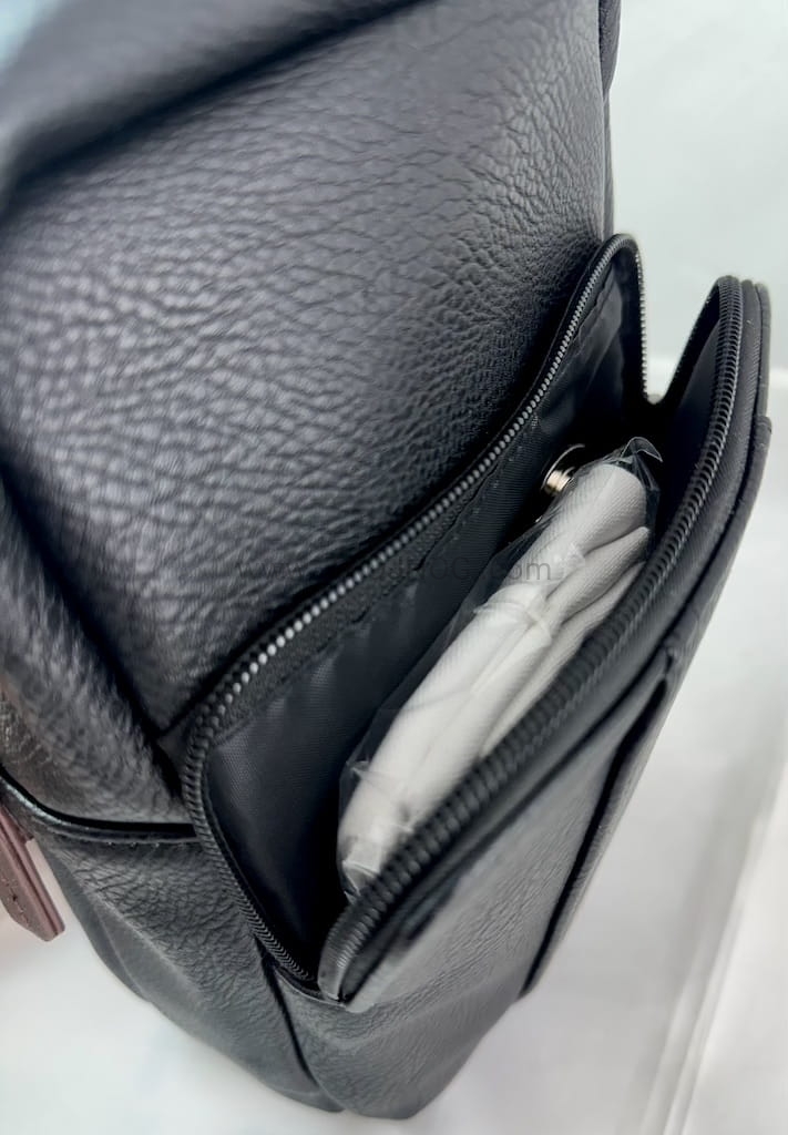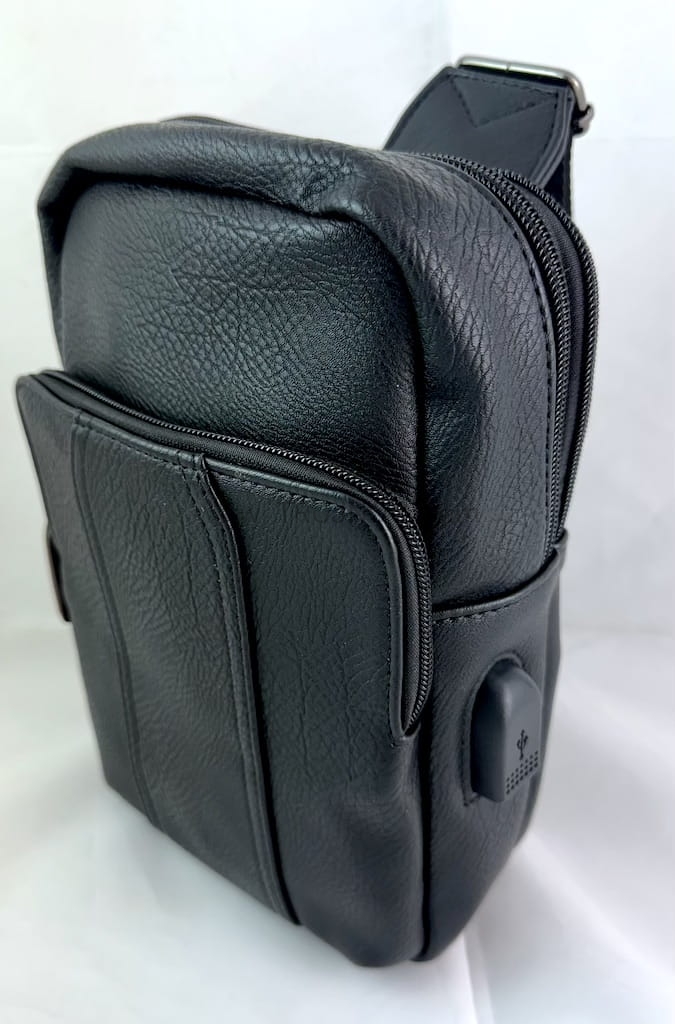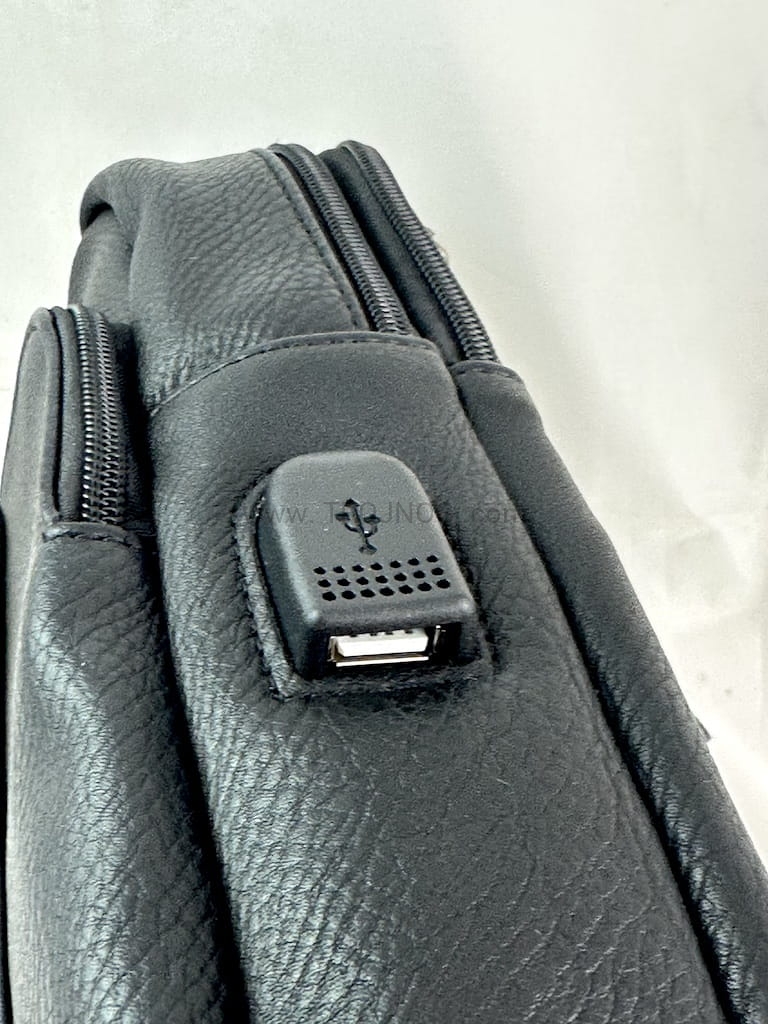Torba posiada regulowany pasek. na ramie, dużo kieszeni na zamek oraz kabel USB do ładowania urządzeń.