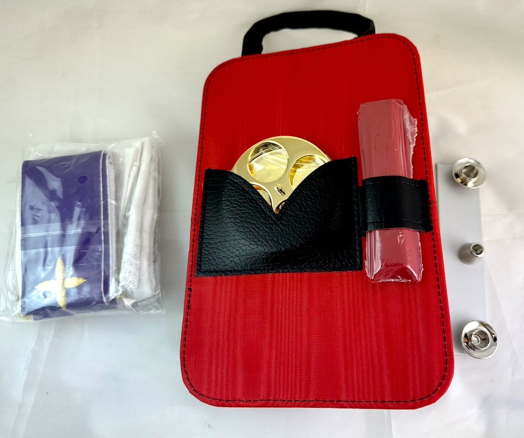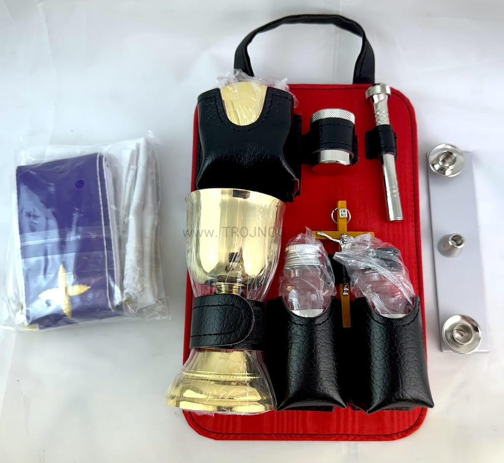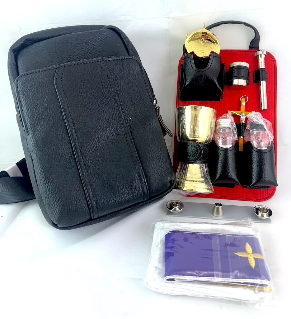 Torba na ramie, z kompletnym wyposażeniem, zestawu małego księdza, do celebracji Mszy Świętej, np. w trakcie pielgrzymki, u chorego, w warunkach polowych.